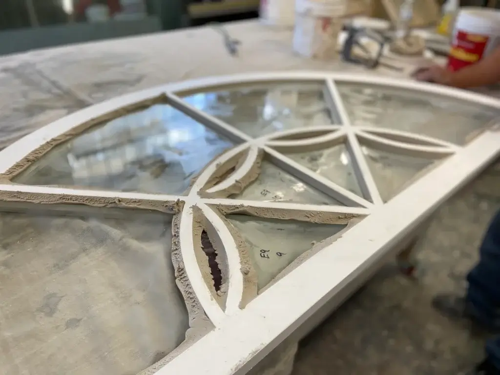Check out our master glazer, carefully setting the glass into the restored sash.